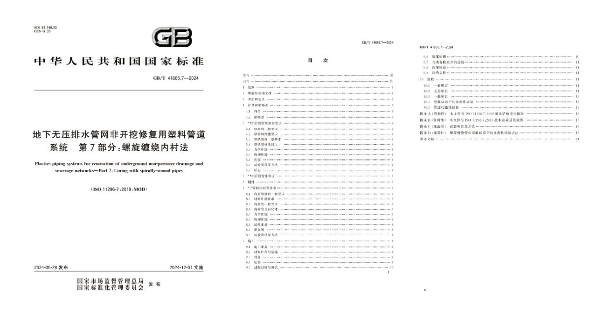 國(guó)家標(biāo)準(zhǔn)《地下無壓排水管網(wǎng)非開挖修復(fù)用塑料管道系統(tǒng) 第7部分:螺旋纏繞內(nèi)襯法》 GB/T 41666.7-2024 正式發(fā)布是由中國(guó)輕工業(yè)聯(lián)合會(huì)提出,全國(guó)塑料制品標(biāo)準(zhǔn)化技術(shù)委員會(huì)(SAC/TC48)歸口。于2024年5月28日批準(zhǔn)發(fā)布,實(shí)施日期為2024年12月1日。